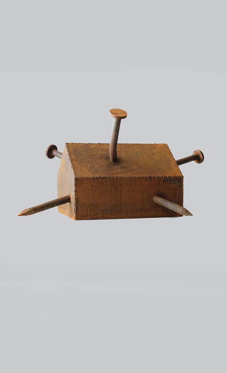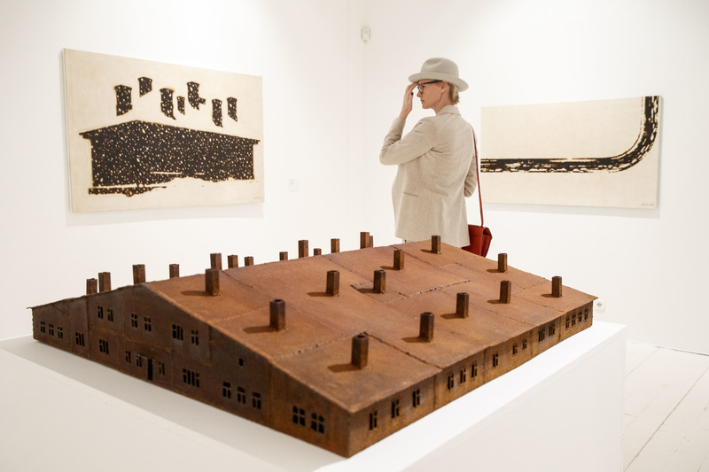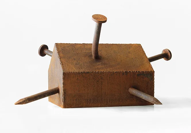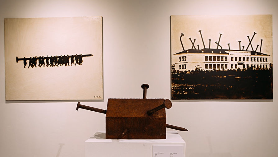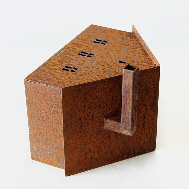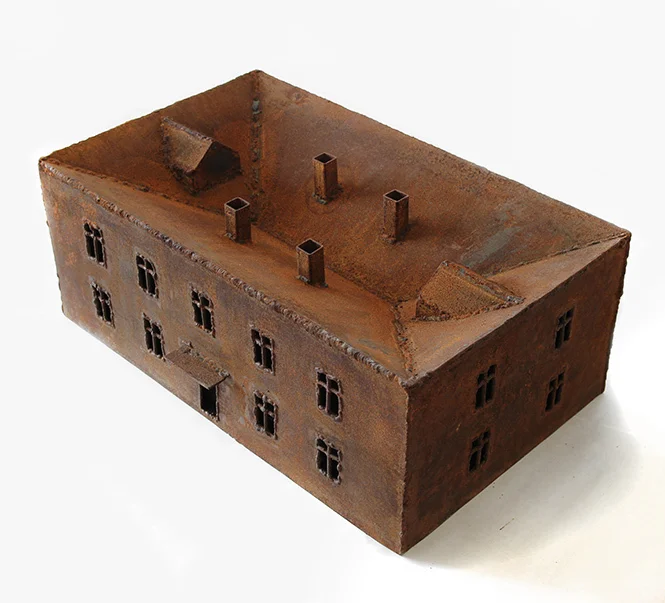 Другая большая группа работ на выставке — металлические объекты, выполненные из грубого ржавого листового железа. Это реверсы культовых объектов и устоявшихся клишированных образов советских пятидесятых — мавзолея, пятиконечных звезд, жилых домов. Такова, например, серия «Деревня», где небольшие макеты советских бараков поданы с измененными, гипертрофированными пропорциями — огромными, иногда вдавленными внутрь, как в объекте «Дом 6» (2016), крышами, маленькими окнами, непропорциональными трубами. Некоторые объекты серии повернуты набок («Дом 7», 2016), или вовсе вывернуты наизнанку («Минус-дом», 2017). Автор использует здесь гротескные приемы, как в формообразовании объектов, так и в передаче смысла — обращение к советскому прошлому задействует узнаваемые образы, но делает из них своеобразных мутантов.