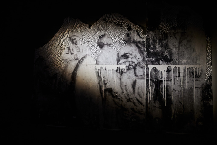 Именно туда выходит главный персонаж выставки, безликий диктатор-генерал неназванной латиноамериканской страны, именно оттуда он будет вещать. Это метафорическое существо имеет черты каждого, но никого конкретно, и отражает своеобразную абсолютную вседозволенность одного безумца. Вот только этот «монолог» перекрывают порезы и раны, так хорошо переданные техникой Федоричева. Наверное, главное произведение на выставке это изображение радостных военных, закрашенных битумом, создавая тем самым пожар или цветок. Венчает все происходящее изображения вечного фонтана власти, который питает всю политическую машину генерала-диктатора. Наверное, в этом плане символично, что основным материалом для выставки Федоричев выбирает битум, как отсылка к нефти, топливу новейшей истории.
