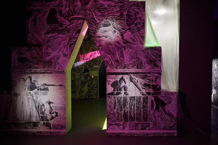 Проект, который хочется упомянуть это персональная выставка Егора Федоричева «Акт II. Гилея». Название — это своеобразная игра со зрителем, она немного помогает понять происходящее на экспозиции: действие происходит на латиноамериканской театральной авансцене54.