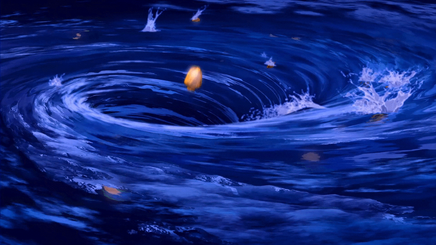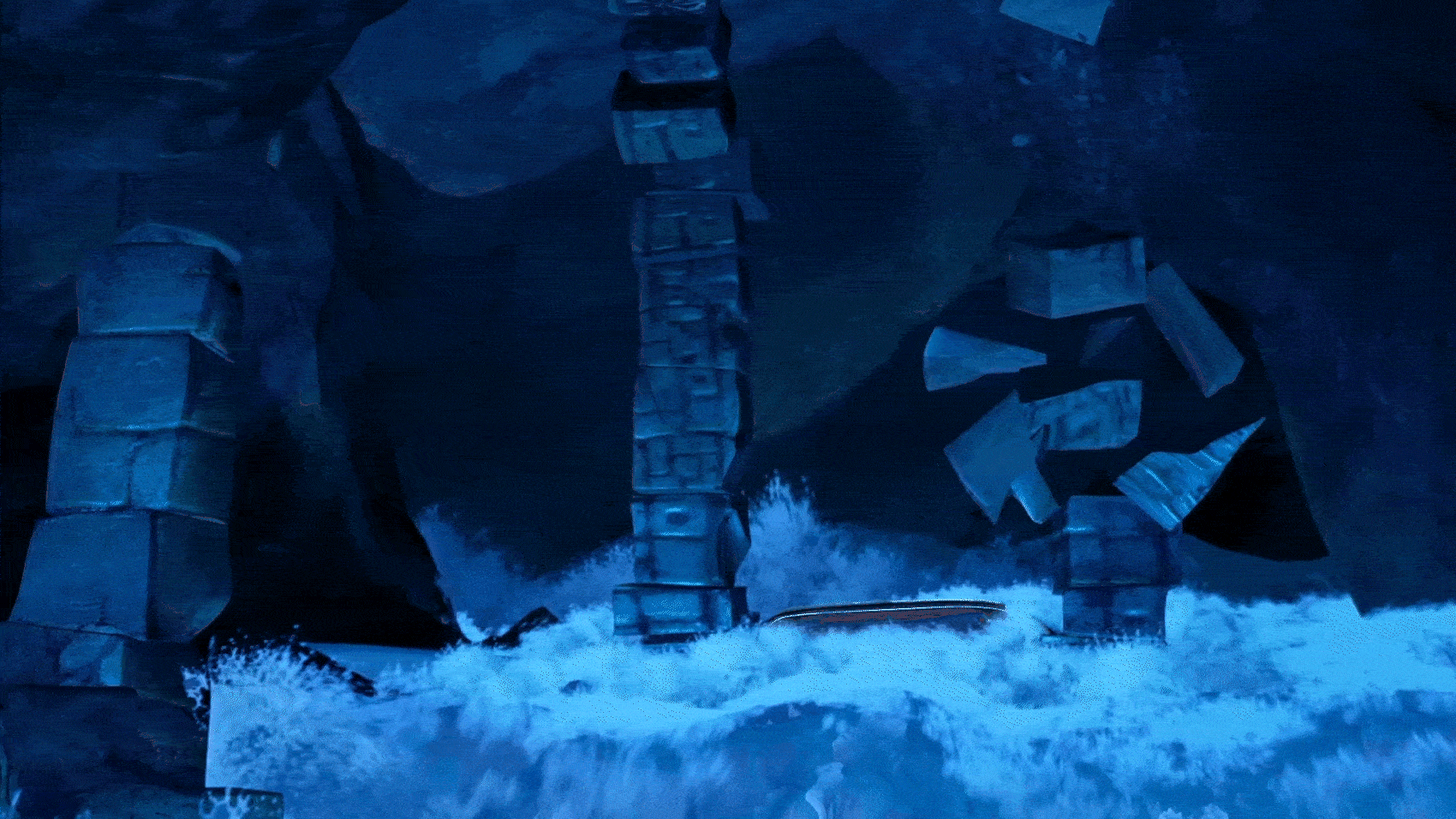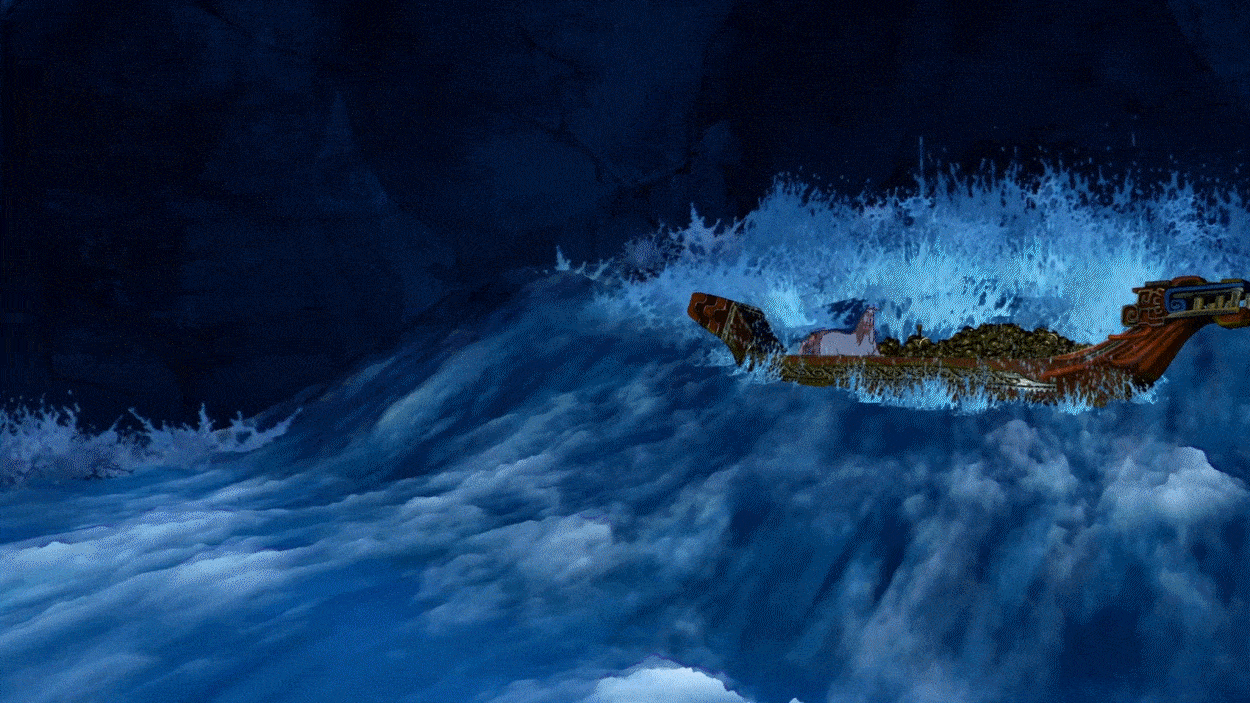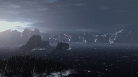 Эпизод из «God of War III» [2010]. Разработчик: Santa Monica Studio. Безжизненное тело Посейдона падает в Эгейское море, и гигантское цунами с молниеносной скоростью вырывается из воды