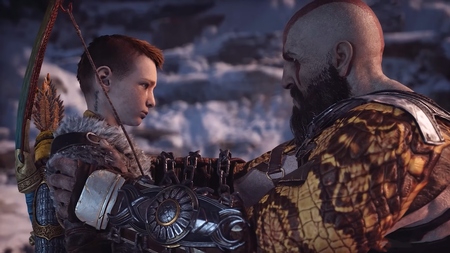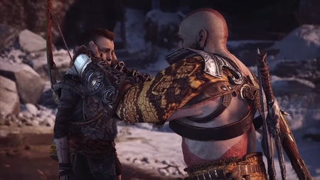 1-2. Скриншоты из «God of War» [2018]. Разработчик: Santa Monica Studio. Кратос пытается убедить Атрея, что путь бога может обойтись без насилия