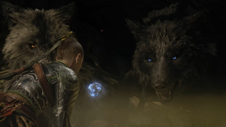 1-2. Скриншоты из «God of War: Ragnarök» [2022]. Разработчик: Santa Monica Studio. Атрей с волками Сколь и Хати