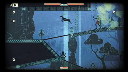 1. Скриншот из игры «Apotheon» [2015]. Герой убегает от Артемиды в форме оленя // 2. Скриншот из игры «Apotheon» [2015]. Артемида сама обращается в оленя, охотятся уже на нее