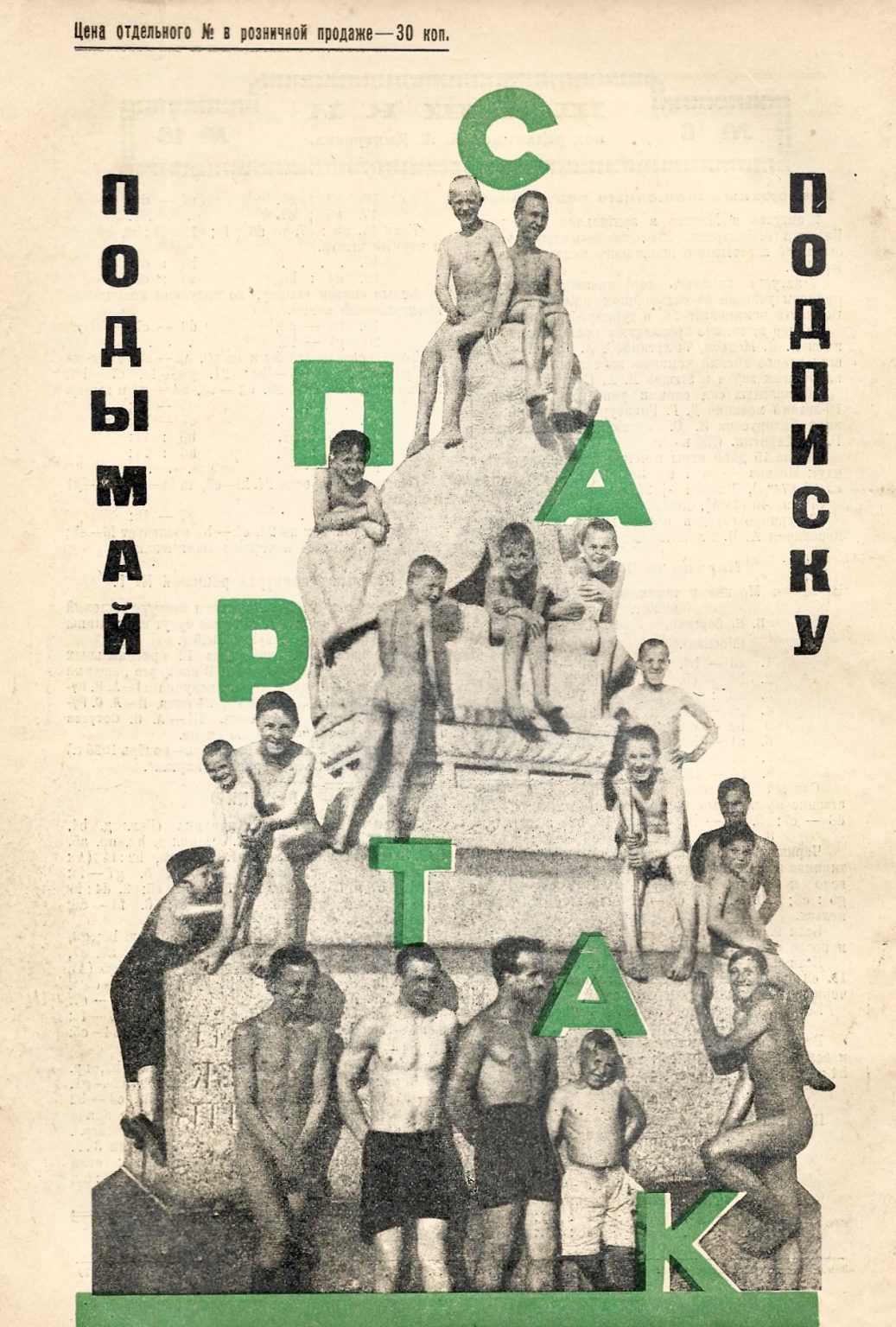 В «Пролетарии связи» диагональные надписи «привет», «работников связи» идут по той же траектории, что стрелка и провода, задавая движение от мегафона к лозунгу. Здесь буква — такой же активный элемент, как фигура и объект, а вся конструкция держится на ритме и направлении типографики. В «Спартаке» зелёные буквы разрозненно рассыпаны по телам ребят и ступеням, как будто они взбираются вместе с ними наверх: слово превращается в ступени, а не просто подпись. Текст не сопровождает изображение, а сам строит и оживляет композицию.