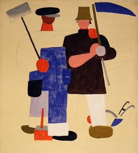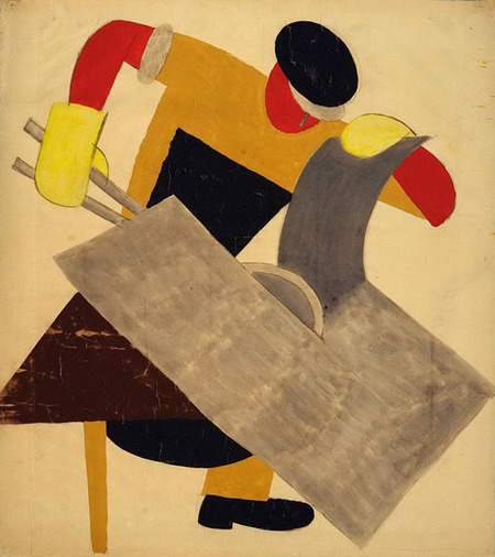 В серии листов Лебедева фигура человека превращается в конструктор из простых геометрических модулей. Крестьян и рабочих он собирает из прямоугольников, цилиндров и кругов: головы — как красные круги, тела — как блоки, руки и ноги — как вытянутые прямоугольники. Даже орудия труда читаются как набор плоских форм: коса, лопата, лист металла. Благодаря этому композиция держится не на деталях и мимике, а на четкой геометрической схеме, где каждый элемент можно «переставить» или повторить, как модуль. Важна и плоскостность: лишних объёмов и теней нет, фигуры существуют как цветовые пластины на нейтральном фоне, что сближает их не с живописью, а с графическим листом и плакатом. Через такую модульную, почти механическую сборку Лебедев показывает тип, а не отдельного человека: работник и крестьянин становятся универсальными знаками эпохи.