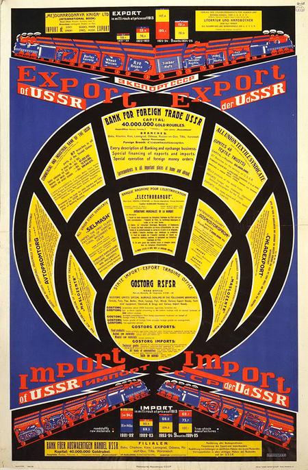 Плакат построен как строгая модульная схема: в центре — круг, разбитый на радиальные сектора-модули, каждый из которых заполняется текстом. Вверху и внизу эту круговую «сетку» дополняют поезда-прямоугольники с данными, тоже выстроенные по линии горизонта. Геометрия кругов, секторов и прямых полос превращает сложную информацию об экспорте и импорте в наглядную, упорядоченную диаграмму.