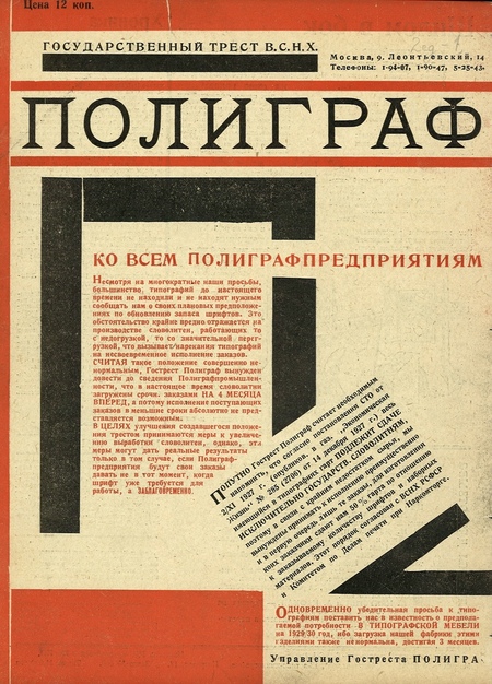 В этих обложках видно, как типографика берёт на себя роль главного изображения. В «Вопросах коммунального хозяйства» само название построено из тяжёлых геометрических букв-блоков, а подзаголовки вписаны в круги, квадраты и диагонали — текст буквально собирается в конструкцию. В «Полиграфе» крупное слово-заголовок и черная Г-образная полоса задают каркас листа, а текстовые прямоугольники и наклонённый блок внизу работают как динамичные модули. В обоих случаях буквы и строки не только сообщают информацию, но и формируют композицию. «Авторы журналов видели моду на геометрические фигуры и смелое преобразование текста — это же они и помещали на обложку.» [5]