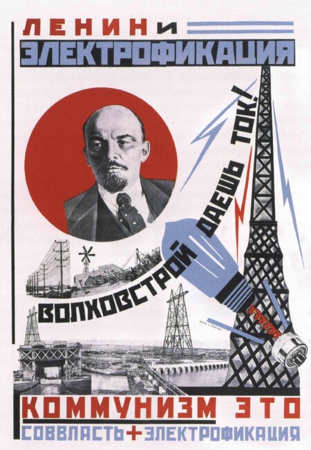 В этом фотомонтаже реальный портрет Ленина превращен в часть фантастической конструкции. Его фигура нечеловеческого масштаба шагает по круговой площадке-схеме, а в руках он держит не реальную опору, а собранный из фрагментов башни и дома символ «электрификации всей страны». Пространство устроено как чертёж: круги, прямоугольные блоки зданий, сетка внизу — всё это не документальный пейзаж, а сконструированная сцена, где фотография, архитектурные планы и графика соединены в один образ. Фото используется не ради правдоподобия, а как материал для идеологически заряженной композиции.
