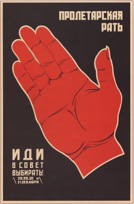 Тут в обоих плакатах цвет простой, но мощный сигнал. В листе с красной рукой палитра сведена к трём тонам: чёрный фон, красная ладонь, светлая кремовая полоска контура и текста. Красный заполняет всю фигуру руки и превращает её в знак-призыв «иди голосовать», чёрный уводит фон назад, а светлый только подчёркивает слоганы — никакой «живописи», только контраст и считываемый жест. В плакате «Ленин и электрификация» схема похожая: красные круг и лозунг, голубые молнии и лампа, черная типографика и серые фотофрагменты. Красный отмечает идею коммунизма, голубой — энергию и ток, а чёрно-белые фотографии играют роль фона-доказательства.