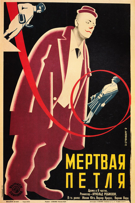 В «Мёртвой петле» всё строится на красной дуге траектории: она закручивает пространство, связывает лётчика, крупную фигуру мужчины и маленькую женскую фигуру в круге. Лист читается как один закрученный маневр, а не набор отдельных персонажей.